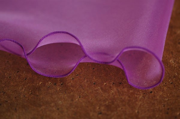さまざまなバリエーションをお楽しみいただけるリーフデザインです。(えんぴつのように両端がとがっています) シンプルなオーガンジーショールですが、贅沢にバイアスで裁断し、ふちが波打つようにデザインしています。