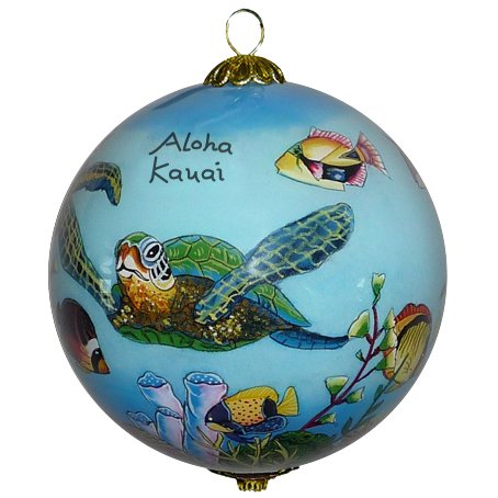 - LARGE HONU SEA TURTLES swimming side by side with the Humuhumu and other tropical fish painted in vivid detail in this Kauai ornament; the ornament will be a stand out on your Christmas tree; includes the words “Aloha Kauai”