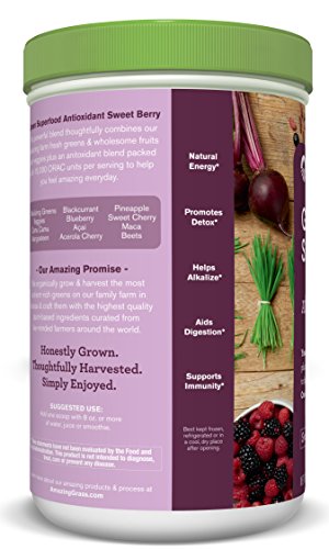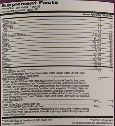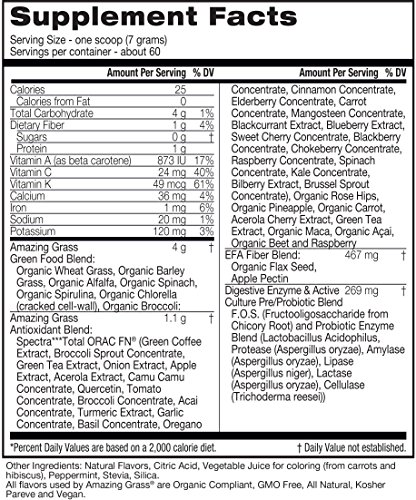 Studio : Amazing Grass Publisher : Amazing Grass Binding : Grocery Product Description This powerful blend thoughtfully combines our alkalizing farm fresh greens and wholesome fruits and veggies plus an anitoxidant blend packed with 15,000 ORAC units per serving to help you feel amazing every day. At Amazing Grass our roots run deep...Back to our family farm in Kansas, where for over 3 generations Amazing Grass has organically grown harvested the most nutrient-dense greens on earth. Today, we thoughtfully craft our greens with the highest quality, plant-based ingredients curated from like-minded farmers from around the world. Amazing Grass products are a delicious way to nourish your body with the whole food nutrition it needs to feel amazing every day. 0