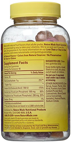 -. Binding : Health and Beauty -. Brand : Nature Made -. EAN : 0031604028459 -. Feature : Bone Support with Vitamin D3 / Natural Fruit Flavors. / Cherry, Orange & Strawberry with Other Natural Flavors. / All Natural Flavors, Colors From Natural Sources, No Gluten or Yeast / No Preservatives. -. IsAdultProduct : 0 -. Label : Nature Made -. Manufacturer : Nature Made -. PackageQuantity : 2 -. ProductGroup : Health and Beauty -. ProductTypeName : HEALTH_PERSONAL_CARE -. Publisher : Nature Made -. Studio : Nature Made -. Title : Nature Made Calcium Adult Gummies 80 ct (PACK OF 2) -. UPC : 031604028459