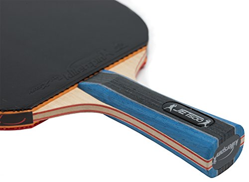 The Killerspin JET500 table tennis racket is a model of balanced speed and control with a high-quality wood blade and ITTF-approved competition rubbers. The meticulously engineered blade is made of 5 layers of premium wood at a 6.7mm thickness (thickest iFeature