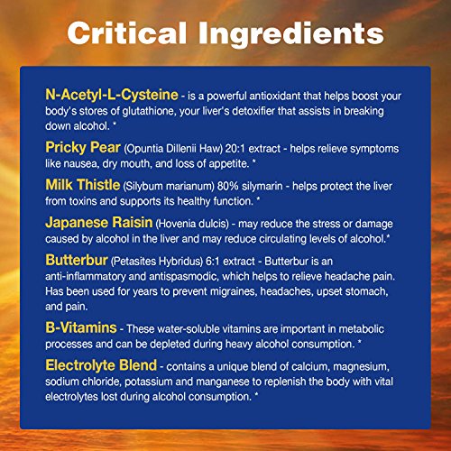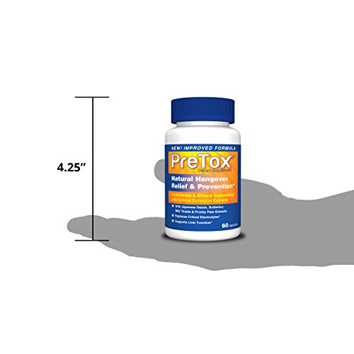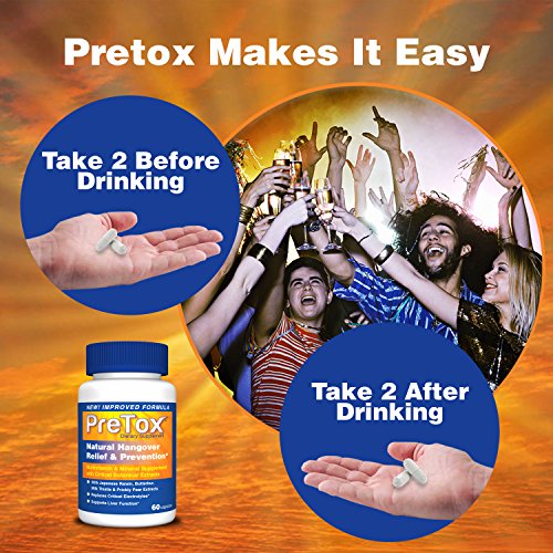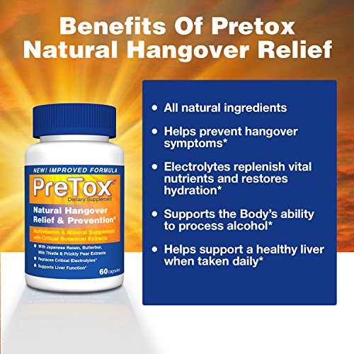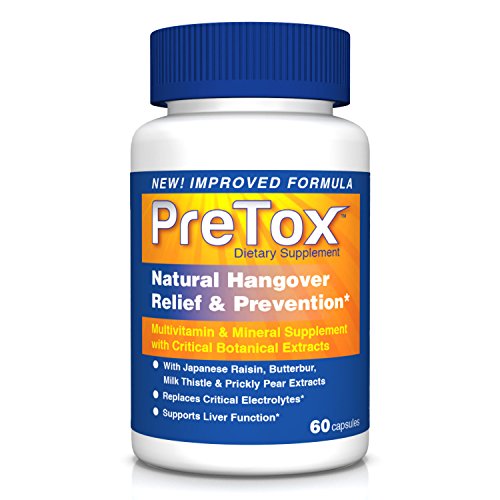 -. Feature : HELPS PREVENT HANGOVER SYMP - PreTox helps to reduce the effects of drinking alcohol that would normally result in a hangover; it helps your body process the alcohol much more efficiently and supports healthy liver function without caffeine or pain relievers that put excess stress on your liver / ALL NATURAL INGREDIENTS: Pretox contains all-natural ingredients such as P.R.Ickly pear extract - scientifically studied to help reduce hangover symp by reducing the body's inflammatory response*, Japanese raisin tree extracts - helps the body metabolize alcohol quickly and efficiently, Butterbur - treats headaches and migraines and Milk Thistle - helps prevent liver damage, soothes nausea, relieves indigestion and improves blood flow / ELECTROLYTE MINERAL BLEND REPLENISHES VITAL NUTRIENTS AND RESTORES HYDRATION. A unique blend of nutrients including vitamins, minerals, antioxidants, amino acids and natural herbal extracts help you beat the typical effects of a hangover. A powerful blend of calcium, magnesium, sodium, chloride, and potassium will help you recover from a night's drinking in no time / SUPPORTS THE BODY'S ABILITY TO PROCESS ALCOHOL. N-Acetyl L-Cysteine helps the body metabolize alcohol by boosting your body's supply of glutathione, a powerful antioxidant, which in turn supports the immune system and helps your body cope with the oxidative stresses of alcohol / HELPS SUPPORT A HEALTHY LIVER WHEN TAKEN DAILY. PreTox isn't just for drinkers. Take 1 PreTox capsule daily to help support healthy liver function. Our supplements are manufactured in the USA following strict GMP standards using the highest-quality ingredients. RELIEVES THE SYMP OF HANGOVERS OR YOUR MONEY-BACK - 100% Money Back Guarantee