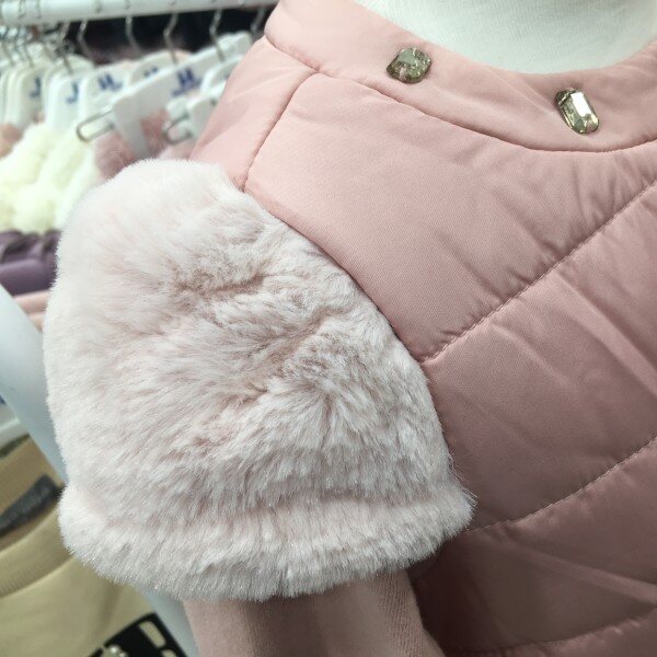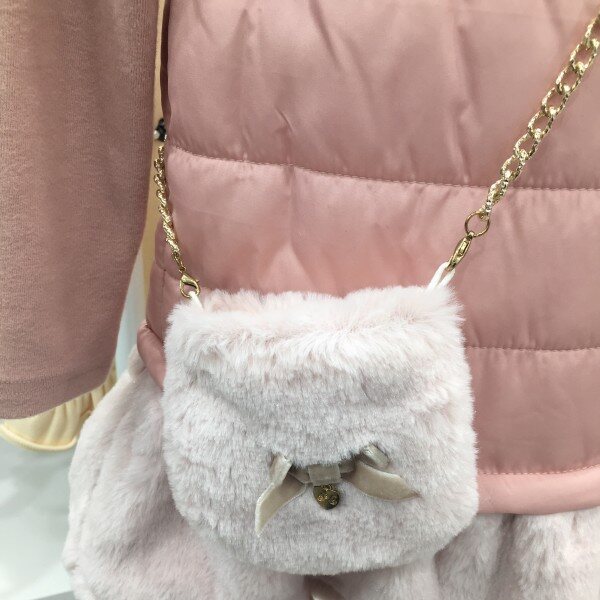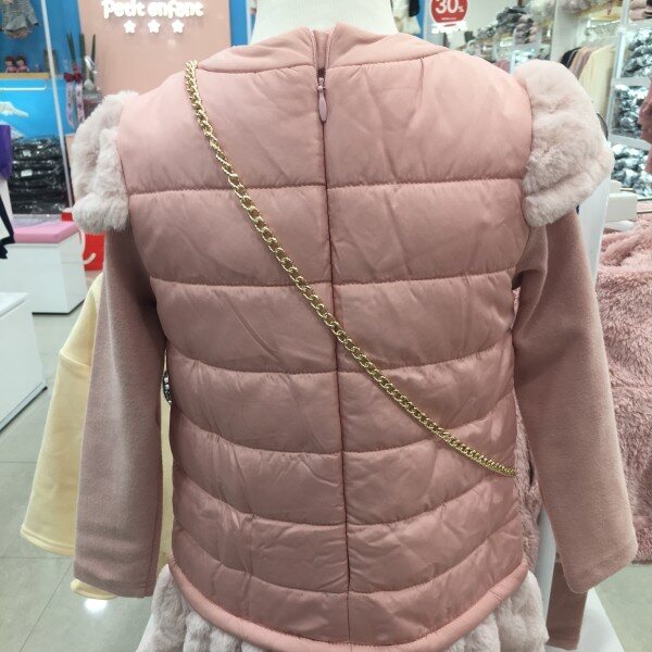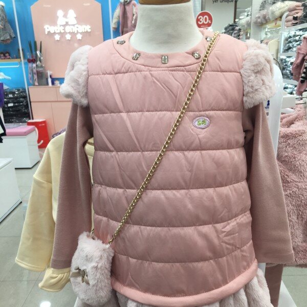원피스에 패딩조끼를 입은거같은 유니크한 디자인의 러블리한 제품이에요~ 밑단과 어깨의 부드러운 털이 한번 더 포인트를 주었구요~ 가방과 세트 상품이에요^^