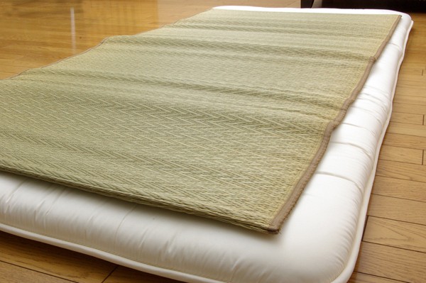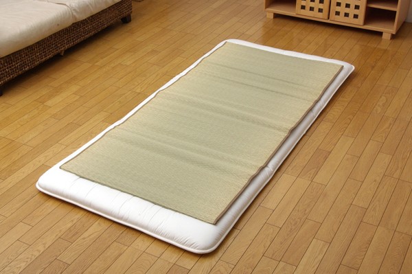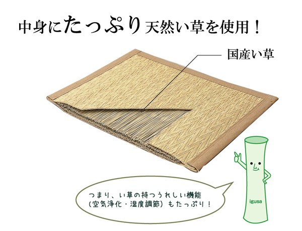 国産(熊本県八代産)のい草を贅沢にたっぷり使用したネゴザ(寝ござ)です。国産のイ草は一本一本が太く、表皮が厚く繊維がキメ細かいので、弾力性があり、耐久性に優れています。中材にはゆるく織り上げたイ草を2層使用していますので、適度な自然のクッション性があり、イ草の効能をより感じて頂ける逸品です。また、経済的な両面使用可能リバーシブルタイプです。い草には1.綿の3倍の吸湿性があり汗のじめじめを軽減します。2.湿度の調整作用があり、蒸れにくく快適な就寝を促します。3.汗のにおいの元となる化学物質を90%以上抑え、においを軽減します。などの効果があります。い草に青森ヒバ加工を施しています(抗菌・防臭効果)。