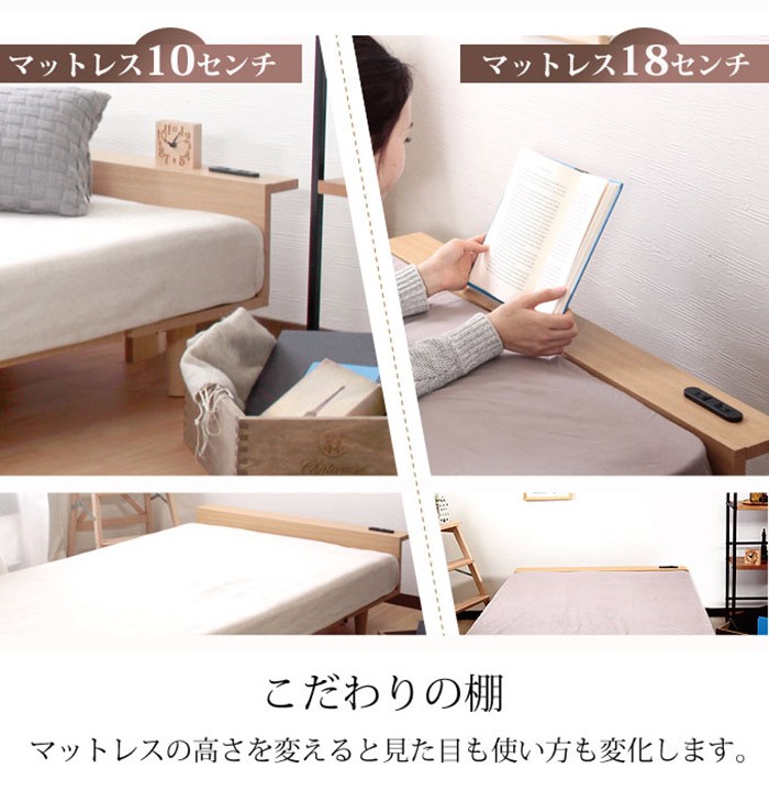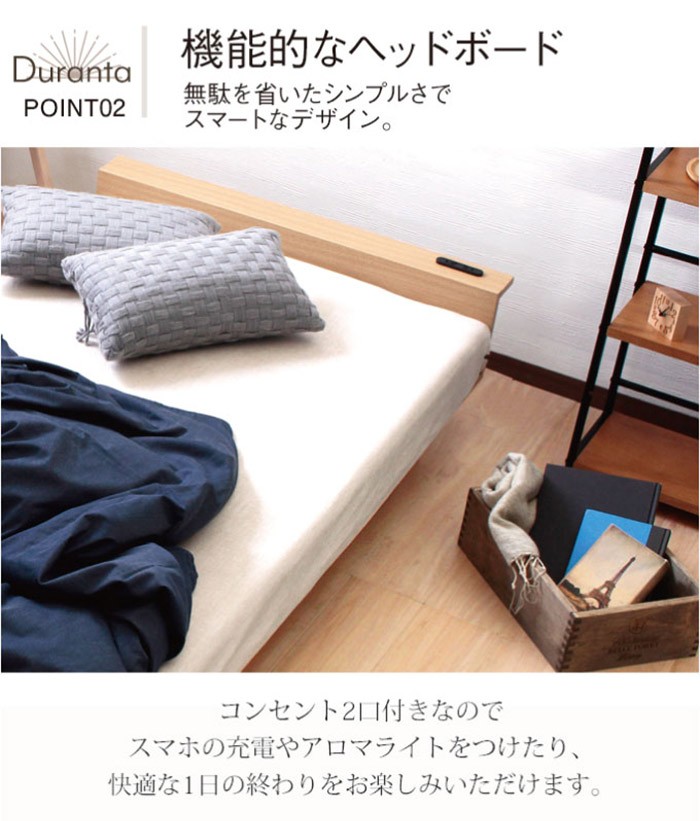 ●ヘッドボードにはスマホや雑貨が置ける棚スペースに、2口コンセント付で