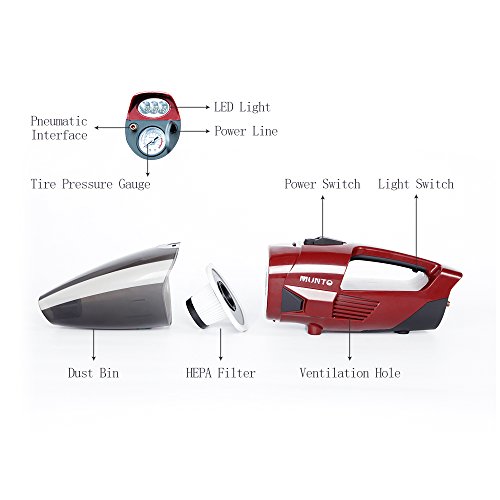 MUNTO CAR VACUUM CLEANER 4-IN-1 MULTIFUNCTIONAL PORTABLE HANDHELD WITH AIR INFLATOR, TIRE PRESSURE GAUGE AND LED LIGHT 4000PA 120W WET/DRY WITH 16.4FT CAR CIGARETTE LIGHTER POWER CORD