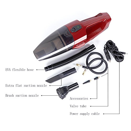 Functions Vacuum: Connect the vacuum to the car cigarette lighter socket, turn on the switch. Air Inflator: Connect the vale tube into the vacuum pneumatic interface, turn on the switch; Tighten the other head of the tube to the tire valve after the vacuum run for a while; Cut off the switch and remove the tube when comes to the proper tire pressure. Tire Pressure Gauge: Transform the vacuum into the tire valve, measure the tire pressure. LED Light: Turn on the light switch under the handle.