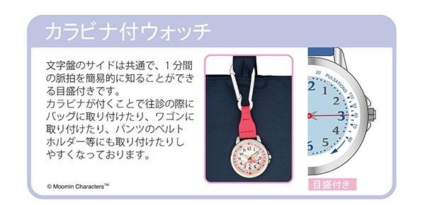 看護師さんはもちろん、介護士さんや保育士さんにもお使いいただけるカラビナ付きウォッチ。文字盤の外周メモリには脈拍計測用のメモリが付いています。 |