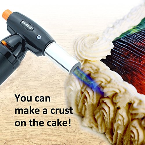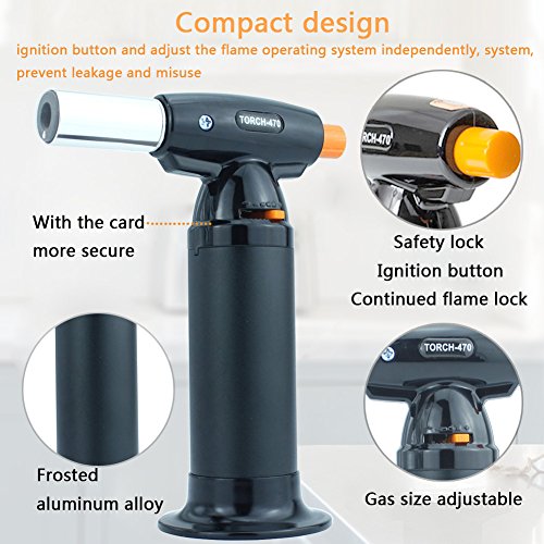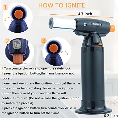 PREMIUM QUALITY COOKING TORCH : Adjustable controls to customize anti-flare flame to perfection. Heats up to 1300°C/2370°F. Continuous flame option allows for extended use with minimal effort. Durable leak proof design with safety lock.Regulator dial of this kitchen torch easily adjusts for a continuous flame on of up to 6 inches. Highly dependable press button ignition provides reliable and immediate lighting of the torch.