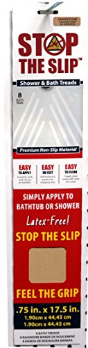 Slipping and falling can be prevented by using Bath Safety Treads. The treads provide a safe, comfortable surface in slippery areas. These sandstone colored vinyl non-skid strips are .75" x 17.5", are packaged 8 pieces per set, and can be easily cut to a different size.