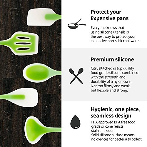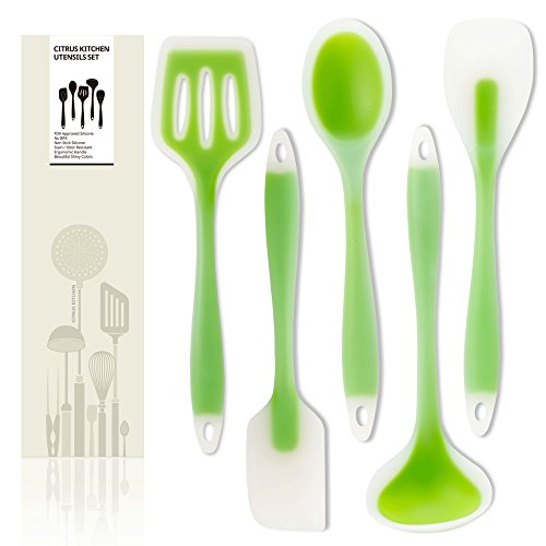 -. Feature : HIGH-GRADE PREMIUM SILICONE - CitrusKitchen's cooking utensils are made from high-grade BPA Free and FDA approved silicone, designed to withstand temperatures of up to 480 degrees. Unlike your run of the mill plastic or bamboo utensils, these are safe to use with expensive non-stick pans and won't melt, warp or discolor. / COMPREHENSIVE UTENSIL SET - Set of 5 tools includes Spatula, Spoonula, Mixing Spoon, Turner & Soup Ladle. / HEAT RESISTANCE - One piece molded from flexible, durable silicone, heat resistant to 482ºF. / HYGIENE - Silicone resists stains and will not absorb odors or flavors. Dishwasher-safe heads remove for easy cleaning. / FULL CITRUS KITCHEN WARRANTY- If you're not completely satisfied with your purchase simply let us know and you'll be offered a FULL refund or replacement on this spatula set, no questions asked. Enjoy this absolutely RISK FREE purchase today by clicking the yellow 'Add to Cart button' above