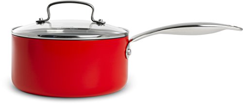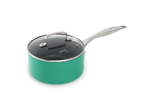 The Fiesta turquoise 2qt covered sauce pan adds a pop of color to any kitchen. It has a turquoise aluminum body with a stainless steel handle. Complete with Thermolon healthy ceramic non-stick coating in grey. Manufactured without PFOA and heat resistant up to 850oF, Thermolon is easy to clean and requires less oils and fats when cooking. Glass lid included.Feature