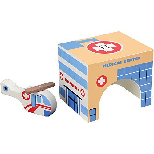 Enhance block play with these four all-wooden buildings. Each building features a wide opening for easy traffic movement and the hospital comes with a medical helicopter. Other buildings includes are a police station, fire house and school. (Unit Blocks sold separately).Feature
