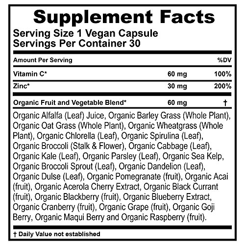 Ingredients include: Zinc, Vitamin C, Organic Fruit and Vegetable Blend: Organic Alfalfa (Leaf) Juice, Organic Barley Grass (Whole Plant), Organic Oat Grass (Whole Plant), Organic Wheatgrass (Whole Plant), Organic Chlorella (Leaf), Organic Spirulina (Leaf), Organic Broccoli (Stalk & Flower), Organic Cabbage (Leaf), Organic Kale (Leaf), Organic Parsley (Leaf), Organic Sea Kelp, Organic Broccoli Sprout (Leaf), Organic Dandelion (Leaf), Organic Dulse (Leaf), Organic Pomegranate (fruit), Organic Acai (fruit), Organic Acerola Cherry Extract, Organic Black Currant (fruit), Organic Blackberry (fruit), Organic Blueberry Extract, Organic Cranberry (fruit), Organic Grape (fruit), Organic Goji Berry, Organic Maqui Berry and Organic Raspberry (fruit)
