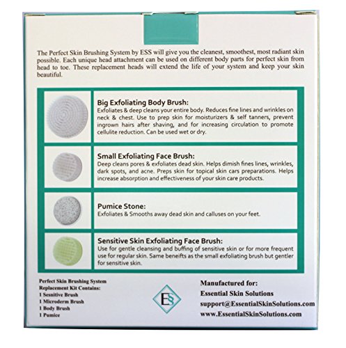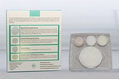 -. Feature : Set of 4 Replacement heads for the Perfect Skin Brushing System by Essential Skin Solutions / Set includes: (1) Large Body Exfoliating Skin Brush , (1) Small Microdermabrasion Face Brush , (1) Small Sensitive Skin Facial Cleansing Brush , and (1) Pumice Stone for Pedicure Smooth Feet