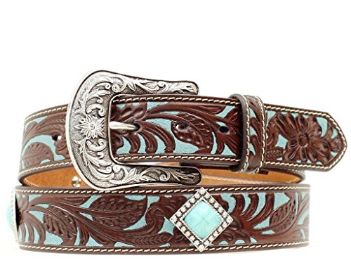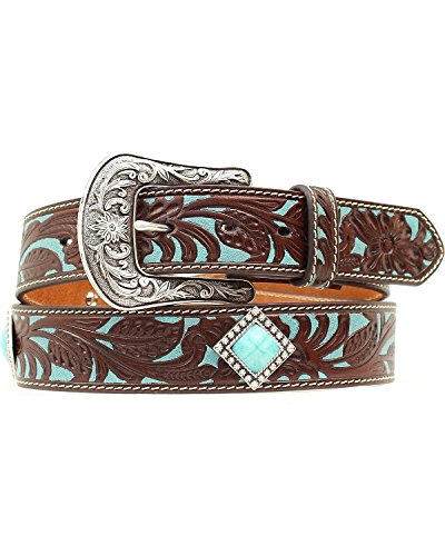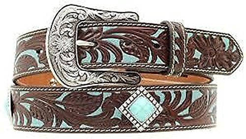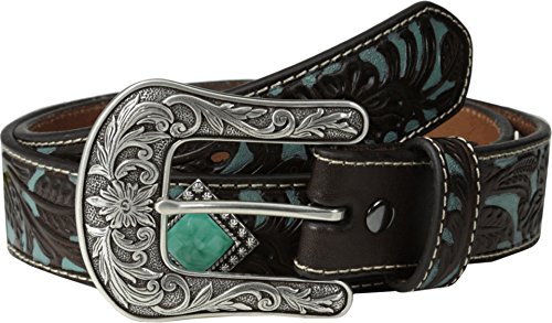 Studio : Ariat Publisher : Ariat Binding : Apparel Product Description Floral stamped leather lends to the western appeal of this Ariat belt, but the bling encrusted belt buckle is all about the fashion This belt features a tooled design with turquoise painted accents. Women's Ariat belt measures 1 1/2" wide. Sizes: S(28-30), M(32-34), L(36-38), XL(40-42). 0