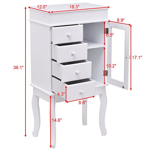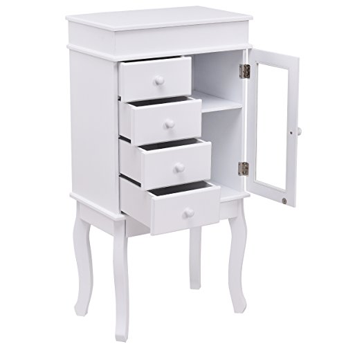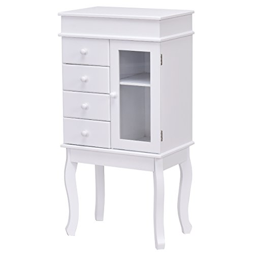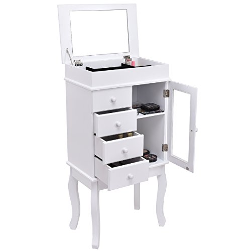 Studio : Giantex Publisher : Giantex Binding : Kitchen Product Description Description: This is our newly designed jewelry cabinet with mirror on top, which serves as a perfect example for large storage capacity. The 4 drawers save you a large space for your favorite accessories such as bracelets, glasses, ties, scarves, watches, perfumes. The right side Shelves with glass door not only can place your cosmetics and jewelries, but also can store and display the items .You can save your favorite accessories safely and in an organized manner, and dressing mirror and jewelry cabinet cleverly combines is convenient and practical. It makes it easy to choose your jewelry in the morning without the frustration of looking for missing pieces. If you are looking for a jewelry cabinet, don't hesitate to buy it!