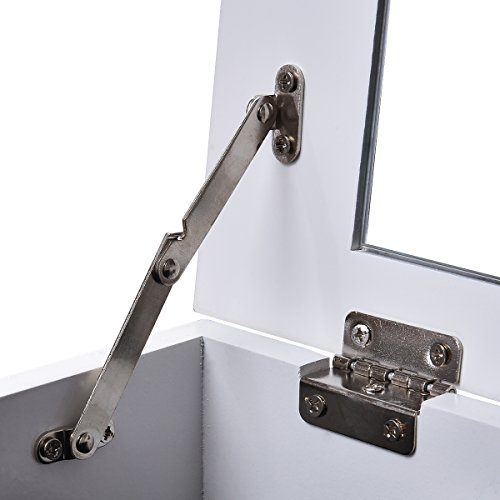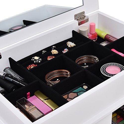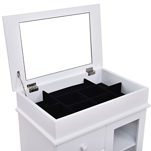 Feature: Features solid MDF body and wood leg is durable and sturdy Large multi function 4 removable drawers Top compartment features ring/ear studs slots, watch/bracelet slots Four drawers and two tier storage shelf with glass door provide powerful storage capacity Dressing mirror and jewelry cabinet cleverly combines is convenient and practical The transparent glass door shelf can display and store your jewelries well Nicely designed shape with 4 strong feet on bottom Suitable for all types of jewelries Assembly Required