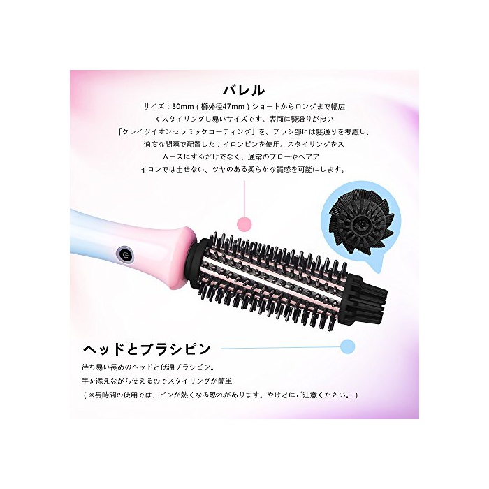 MCH히터는 열전도율이 높고, 순식간에 뜨겁게(나름)모습(두 개PTC내부에 들어감,타사 보다 열전도율이 높게(나름)모습)고, 약1분에 급속 가열 시간이 없는 바쁜 아침 아침으로 보물(보배) 합니다.발열하는 파이프 부분이 브러시의 핀에 덮혀 있으므로,거들면서(도)의 스타일링도 OK! ※장시간 사용하시면,브러시(핀)부분 등의 파이프 주변도 뜨겁게 되기 때문에,주의해 주십시오.