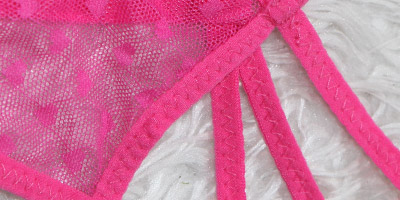 透明的抹胸,半露半掩,性感的蝴蝶结及长长的彩带,更显性感妩媚。下身配同质地T裤,胯部为二根纤细弹性丝带,底部仅一根带子,完全显露出女人臀部的性感曲线 |