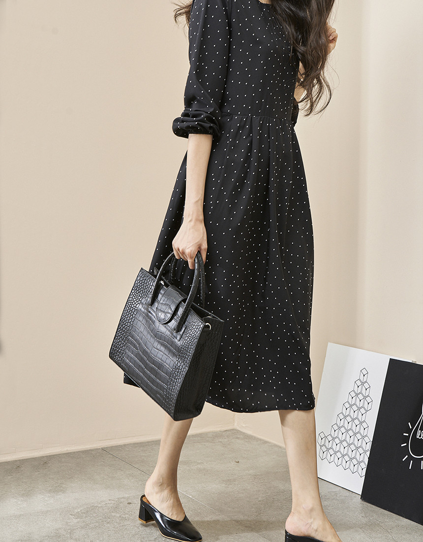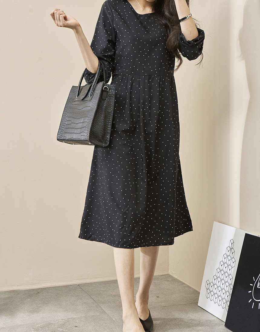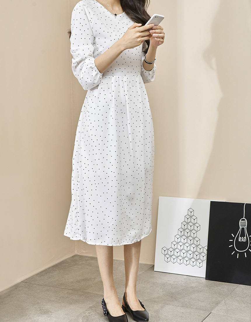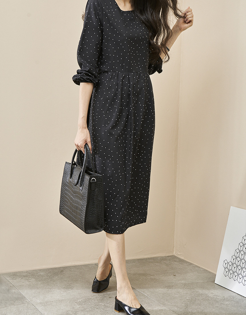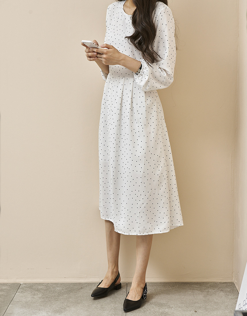 #도트 라운드 스트랩 긴팔 롱원피스