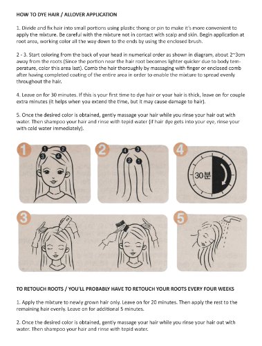 - Feature : MANUFACTURED DATE IS PRINTED (GOOD FOR 36 MONTH) / SOMANG CLINIC HAIR COLOR CONTAINS 1,200mg OF KERATIN THAT SUPPLIES NUTRITIONS TO YOUR HAIR, CERAMIDE THAT MOISTURIZE YOUR HAIR, GLYCYRRHIZA EXTRACT (M.A.G) THAT PROTECTS YOUR SCALP AND CAMELLIA OIL THAT SHINE YOUR HAIR / MANUAL IN ENGLISH NOT INCLUDED - REFER TO BELOW PICTURES FOR DIRECTONS OR REQUEST US INSTRUCTIONS & PRECAUTIONS IN PDF PLEASE / CLINIC COLOR COMES WITH HAIR DYE (NO.1) 60g, OXYDIZING (NO.2) 60ml, HAIR SAMPOO 6ml, HAIR PACK (CONDITIONER) 6ml, COMB & BRUSH, PLASTIC GLOVES & CAPE AND MANUAL IN KOREAN / HYPO-ALLERGENIC HAIRCOLOR / CLINIC COLOR CONTAINS p-PHENLENEDIAMINE, m-AMINOPHENOL & PROPYLENE GLYCOL - MUST CONDUCT SKIN PATCH TEST 48HRS PRIOR TO DYEING / RESULT MAY VARY / MADE IN S. KOREA / PACKAGE QT: 1