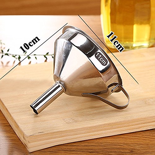 -. Feature : Funnel, very convenient and practical, when water poured into the bottle, do not worry about the hot hand or spill. / Can also be used to the kitchen filling oil, irrigation shower gel, liquid detergent and so on. / It can also be used in the kitchen soy sauce, cooking wine, cooking oil and other. / Filling with hanging hole for easy storage, especially designed. / Stainless steel funnels ideal for filling small bottles and containers. Hand washing recommended.