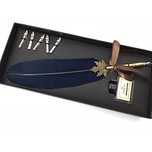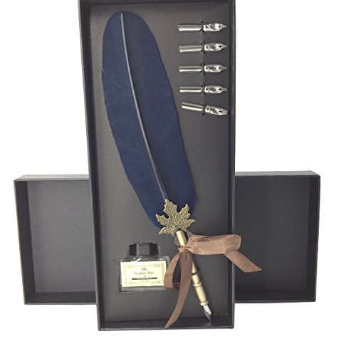 ShinMor Dip Pen Set Antique Feather Copper Pen Stem Calligraphy Writing Quill Ink Dip Pen (Navy)