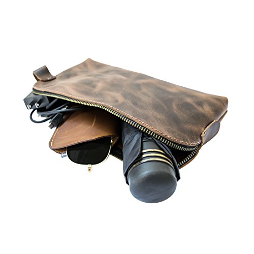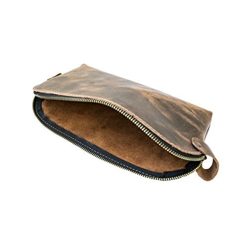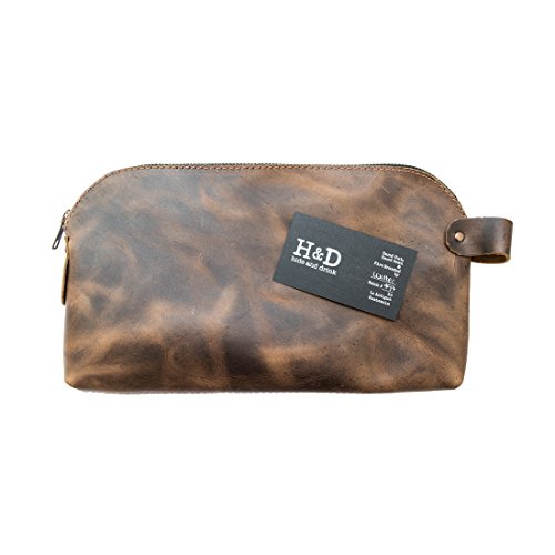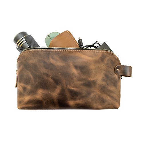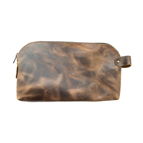 - HANDMADE FROM FULL GRAIN LEATHER: The Large All Purpose Dopp Kit is hand-cut and handcrafted using only the highest quality Full Grain Leather. Full Grain Leather is the best leather that money can buy, it’s durable, attractive, and attains a unique patina after time and use. The leather handle is attached using heavy duty brass metal rivets, ensuring durability and a lifetime of use.