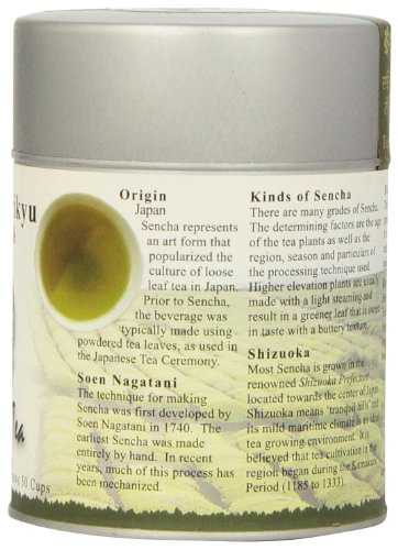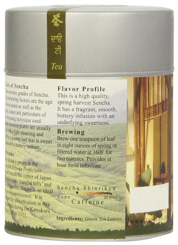 -. Binding : Grocery -. Brand : The Tao of Tea -. EAN : 0689951311955 -. Feature : 3 Ounce tin / Rich, intense aroma -. Label : The Tao of Tea -. Manufacturer : The Tao of Tea -. MPN : NA -. NumberOfItems : 1 -. PackageQuantity : 1 -. PartNumber : NA -. ProductGroup : Grocery -. ProductTypeName : GROCERY -. Publisher : The Tao of Tea -. Size : 3 Ounces -. Studio : The Tao of Tea -. Title : The Tao of Tea, Sencha Shinrikyu Green Tea, Loose Leaf, 3 Ounce Tin -. UPC : 689951311955