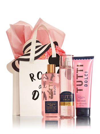 -. Binding : Misc. -. Brand : Bath & Body Works -. EAN : 3757157786376 -. Feature : Ready for you to wrap!_Everything's sweet with this trio of Tutti Dolci treats. Treat someone special to our cleansing Shower Gel (8.4 fl oz), nourishing Body Cream (8 oz) and long-lasting Fine Fragrance Mist (8 fl oz). These favorites come with a pretty gift bag and tissue to make wrapping easy &fun! / Gift Bag measures 7"L x 4.5"W x 10.5"H / The scent of blushing peony blossom, pink currant and white amber dipped in nectar / Online only -. IsAdultProduct : 0 -. Label : Bath & Body Works -. Manufacturer : Bath & Body Works -. MPN : Tutti Dolci -. PartNumber : Tutti Dolci -. ProductGroup : Beauty -. ProductTypeName : BEAUTY -. Publisher : Bath & Body Works -. Size : 8 Ounces -. Studio : Bath & Body Works -. Title : Bath & Body Works TUTTI DOLCI PINK PEONY CRÈME The Daily Trio Gift Kit