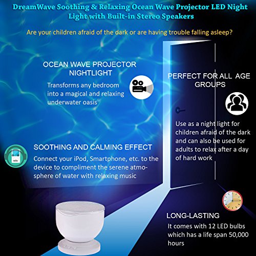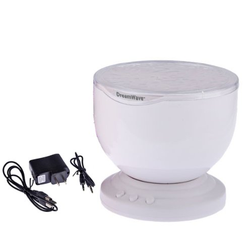 Transforms the room into a tranquil & relaxing underwater oasis. Projects relaxing water waves on the ceiling in 3 colors for a soothing bedtime effect. Creates an enjoyable and relaxing bedtime experience for children. Also perfect for adults to attain a relaxing and calming effect in the bedroom, living room, bathroom or spa. Helps drift into a calm and peaceful sleep. Plug your iPod, MP3, Smartphone, etc. into the built-in speaker to compliment the serene atmosphere with relaxing music (3.5mm Aux-in cable included) Safe; night light stays cool :: Features an auto shut-off; 60 minutes sleep timer. Can also be shut off manually. Power: 5V DC Adapter (included) or via USB plug (included). Can also be powered by 4 "AA" batteries (not included) :: Dimensions: 5" x 5" x 5"Feature