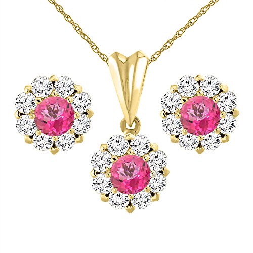 -. Title : 14K Yellow Gold Natural Pink Topaz Earrings and Pendant Set with Diamond Halo Round 6 mm