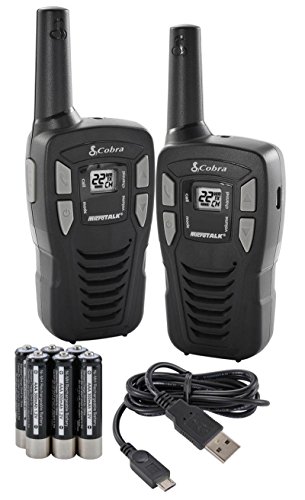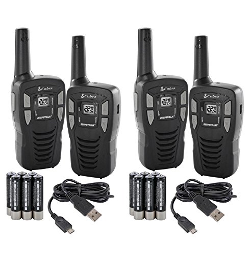 -. Binding : Electronics -. Brand : Cobra -. Color : Black -. EAN : 0022228225355 -. Feature : (4) Manufacturer Refurbished Cobra CXT195 MicroTalk 16-Mile Radios / Be prepared for storms and emergencies with the built-in NOAA radio receiver providing coverage of all government operated weather channels / Call Alert - Provides an easily recognizable alert for incoming calls; Roger Beep Tone - Conformation tone indicates the completion of the user's transmission, and signals to others it is clear to talk / Belt Clip - Secures your microTALK radio while on the go; Includes 6 AAA NiMH Rechargeable Batteries (3 for each radio) / 22 Channels - Front panel push buttons provide easy access to all 22 channels (7 GMRS/FRS, 7 FRS, 8 GMRS); Works with other GMRS/FRS walkie-talkie 2-way radios. -. Label : Cobra -. Manufacturer : Cobra -. PackageQuantity : 1 -. ProductGroup : Car Audio or Theater -. ProductTypeName : TWO_WAY_RADIO -. Publisher : Cobra -. Studio : Cobra -. Title : (4) Manufacturer Refurbished COBRA 16 Mile 22 Ch FRS/GMRS Walkie Talkie 2-Way Radios w/USB Cable | CXT195 -. UPC : 022228225355 This item has been manufacturer refurbished to like brand new condition. All the original accessories that would come with a brand new unit are included. The Cobra CXT195 radios also include rechargeable batteries and a micro-USB charging cable. Roger beep confirmation tone indicates to others it's clear to talk. Power saver circuitry extends battery life when not transmitting or receiving. Call alert provides a recognizable alert for incoming calls. This radio is an affordable and compact option for everyone from the novice to the professional radio enthusiast. With the 22 Channels, the Cobra CXT195 MicroTalk 16-Mile Radios give you the ability to communicate, interference free. It is the perfect radio for travel, as the belt clip fits comfortably and efficiently at your side. The LCD display is easy to see and provides a quick glance of the radio's status, and the Speaker/Microphone/Charger Jack allows you to plug in either a wall charger or headphones.