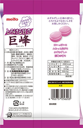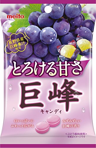 原材料:砂糖(国内製造)、水あめ、植物油脂、濃縮巨峰果汁/酸味料、香料、乳化剤、着色料(アカキャベツ、クチナシ)、糊料(ポリグルタミン酸:大豆由来)