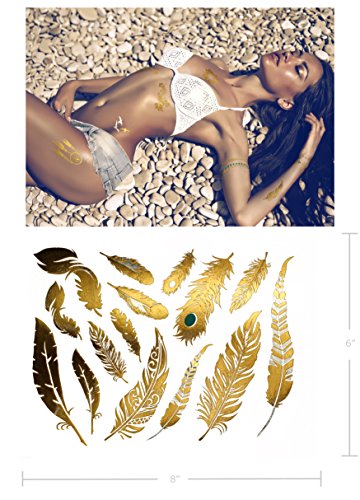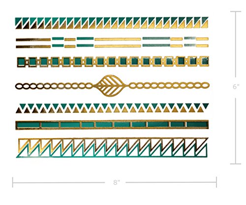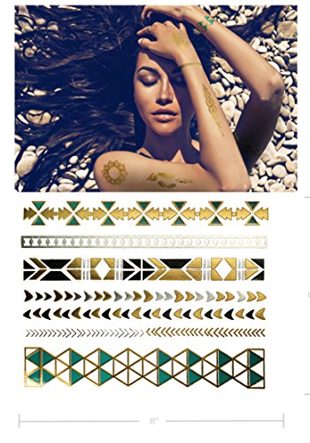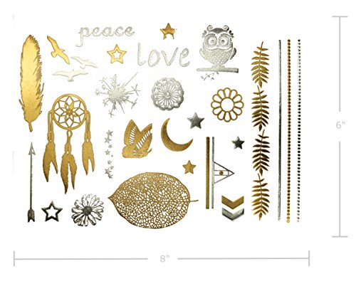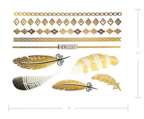 6 X sheets of the latest fake jewelry tattoos. Over 75+ vibrant foil tattoo designs in gold, silver, turquoise and black. Designs include a dreamcatcher, feathers, tribal bracelets, flowers, leaves, armbands and wristbands, rings, links, and stars.