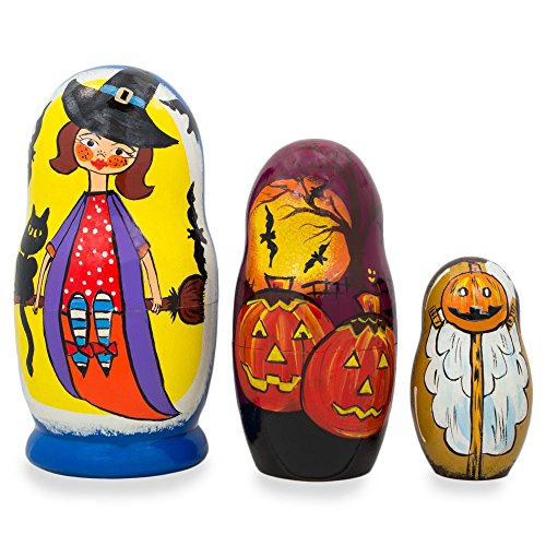 -. Title : 4.25" Set of 3 Halloween Witch and Pumpkins Wooden Nesting Dolls