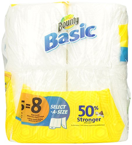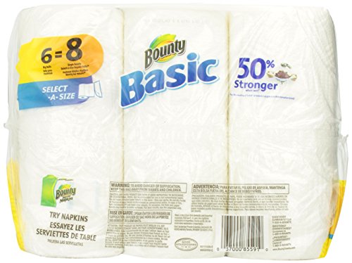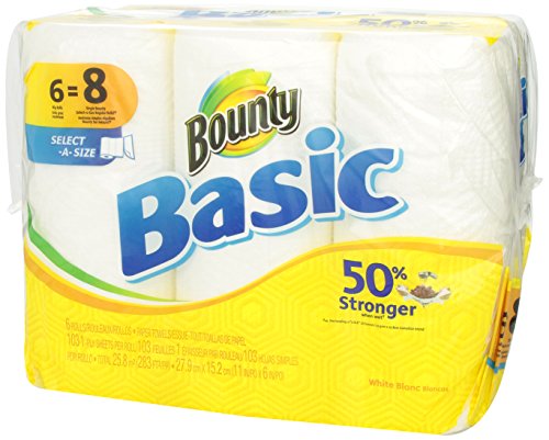 -. Binding : Health and Beauty -. Brand : Bounty -. Color : White -. EAN : 0885781240742 -. Feature : Bounty's diamond weave texture is surP.R.Isingly strong versus the leading bargain brand / Bounty basic paper towels are 50% stronger when wet vest leading 11 inch x 8.8 inch bargain brand / Bounty basic paper towels are affordably P.R.Iced and come in a range of attractive P.R.Ints / Bounty basic earned the good housekeeping seal of approval / 33% more sheets than a regular roll -. IsAdultProduct : 0 -. Label : Bounty -. LegalDisclaimer : TO AVOID DANGER OF SUFFOCATION,KEEP THIS BAG AWAY FROM BABIES AND CHILDREN -. Manufacturer : Bounty -. Model : PG-7198 -. MPN : PG-7198 -. NumberOfItems : 1 -. PackageQuantity : 1 -. PartNumber : PG-7198 -. ProductGroup : Health and Beauty -. ProductTypeName : HEALTH_PERSONAL_CARE -. PublicationDate : 2012-12-31 -. Publisher : Bounty -. ReleaseDate : 2016-10-04 -. Studio : Bounty -. Title : Basic Paper Towels 6 Select-A-Size Big Rolls -. UPC : 885781240742