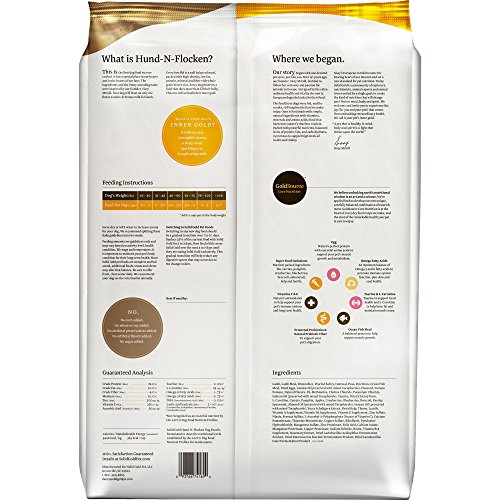 Hund-N-Flocken, the first dog food solid gold ever crafted, has a special place in the hearts of solid gold fans! the ingredients (and the funny-sounding name) were inspired by solid gold founder, sissy McGill. Your dog will feast on only the finest, tender, delicious lamb. Every bowlful is a well-balanced meal packed with high-density protein and whole grain brown rice. Every dog deserves a food that does more than fill their belly. This one will unleash their inner gold. Learn more about Gold Source core nutrition and the solid gold difference: solid gold believes unlocking earth's nutritional wisdom is an art and a science. Solid gold has applied both to develop a unique, carefully balanced combination of nourishment. Gold Source core nutrition is at the heart of every solid gold dry food recipe, and the start of the remarkable health your pet is sure to enjoy. Egg - nature's perfect protein with essential amino acids to support your pet's muscle growth and metabolism. omega Fatty acid blend - an optimum balance of omega -3 and -6 fatty acids to promote immune system function, plus skin and coat health. Taurine and l-carnitine - taurine to support heart health and l-carnitine to help burn fat and maintain muscle mass. Ocean fish meal - a balanced protein to help support muscle growth. protected Probiotics and natural prebiotic fiber - to support your pet's digestion. Vitamins c and e - nature's antioxidants to help support your pet's immune system and long term health. Super food inclusions - nutrient-packed ingredients like carrots, pumpkin, cranberries, blueberries, broccoli, almond oil, kelp and lentils.Feature