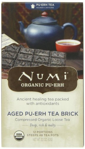 -. Feature : Pack of 1 (2.2 Ounce) loose tea brick; steeps 48 tea pots / Classically compressed organic pu-erh tea with rich, bold flavors with hints of malt / Touted as "the skinny girl's tea" fermented pu-erh tea has been treasured for centuries as a healing tea with a focused energy; packed with antioxidants; traditionally known to aid digestion and boost metabolism / Boxes are made with 85% post-consumer waste and are 100% recyclable. Numi uses natural fiber tea bags that are biodegradable, compostable and non-GMO