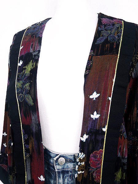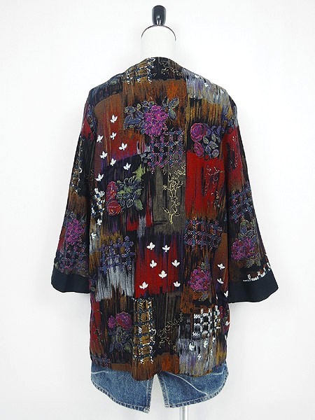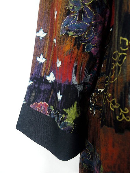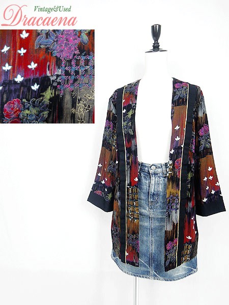 Ladies ブランド- カラー黒ベース メール便不可 コンディション★★★ 素材レーヨン 表記サイズ8 スタッフコメント裏地無し。 実寸サイズ 着丈 71 cm 身幅 45 cm 肩幅 38 cm 袖丈 46 cm ※ウエスト・ヒップ以外は平置き採寸