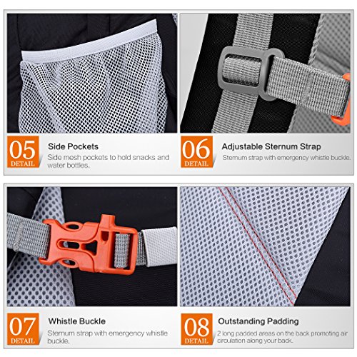 -. Feature : -SBS Zipper:SBS brand zippers,easy to zip and unzip for hking backpack / -Compression Straps:Minimize your pack's profile,reduce excess movement,and keep your gear from getting jumbled. / -Adjustable Sternum Strap:Stm strap with emergency whistle buckle. / -Outstanding Padding:2long padded areas on the back promoting air circulation along your back. / -WARRANTY- Includes 90 days limited warranty.