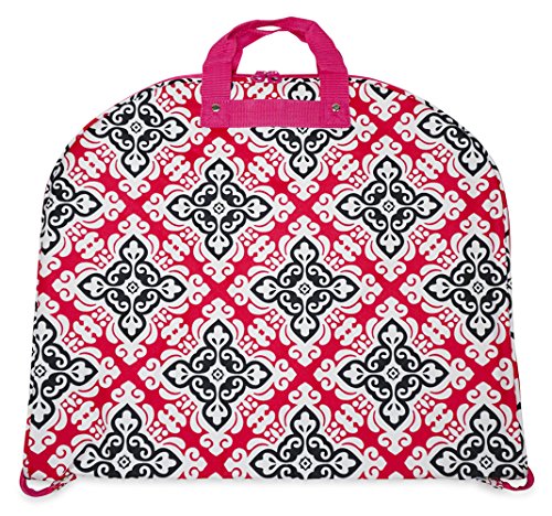 Product Description Take your dress clothes with you confidently on vacation with this stylish garment bag! This piece of lightweight luggage is great for jet setters and can be used for a quick, close by staycation or for a weekend excursion to your favorite retreat. Made out of durable 600 Denier Polyester fabric in a chic print. This garment bag folds in half and can be hung by its metal hook. The interior of this bag features multiple zipper pockets to hold shoes and accessories. Perfect for transporting cheer uniforms or theatre costumes to and from while keeping them clean and wrinkle free! Organize your closet and keep delicate, high quality items neat and pristine. 0