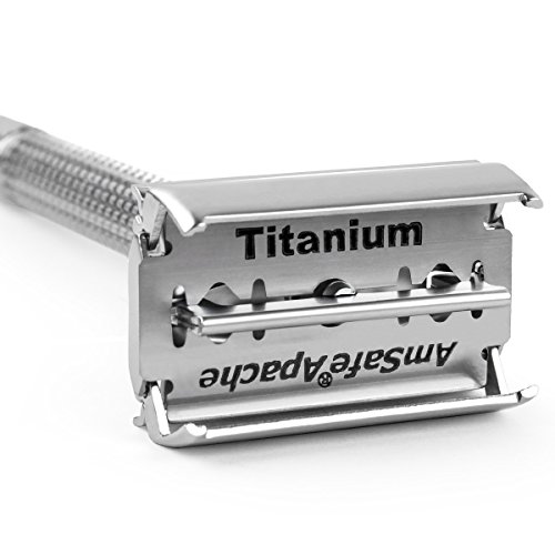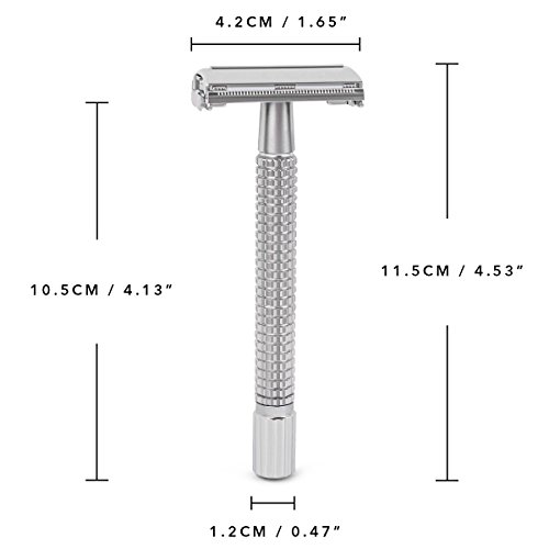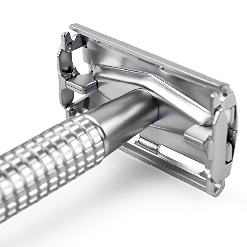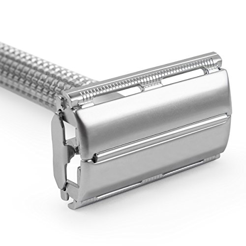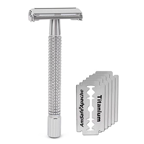 Double Edge 4 inch Long Handle Safety Razor Twist Butterfly Open Chrome Matte Finish (1 Razor + 5 pcs Titanium Coated Blades)