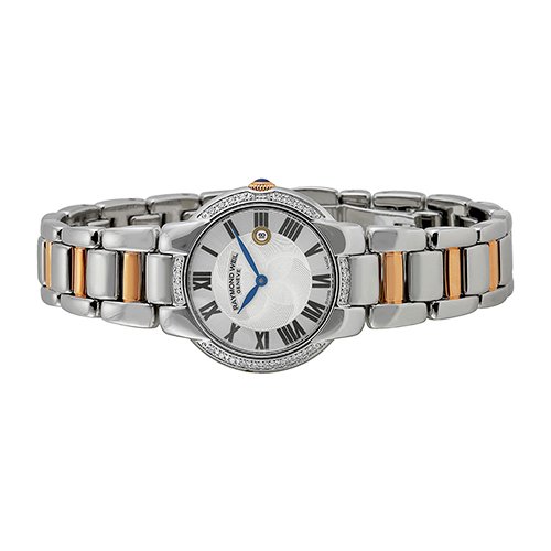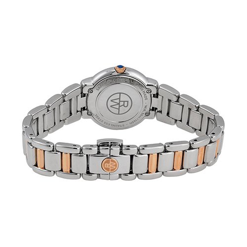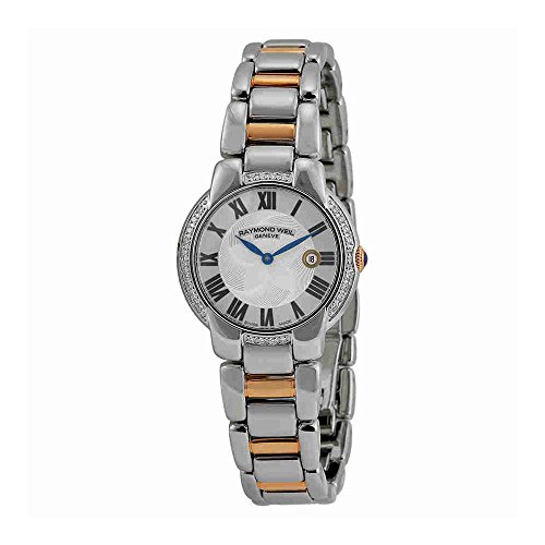 Studio : Raymond Weil Publisher : Raymond Weil Binding : Watch Product Description Stainless steel case with a stainless steel bracelet with rose gold PVD links. Fixed stainless steel bezel set with diamonds. Silver dial with blue hands and Roman numeral hour markers. Dial Type: Analog. Date display at the 3 o'clock position. Quartz movement. Scratch resistant sapphire crystal. Solid case back. Case diameter: 29 mm. Round case shape. Fold over clasp with a push botton release. Water resistant at 50 meters / 165 feet. Functions: date, hour, minute, second. Dress watch style. Watch label: Swiss Made. Raymond Weil Jasmine Silver Dial Steel and Rose Gold PVD Diamond Ladies Watch 5229-S5S-01659. 0