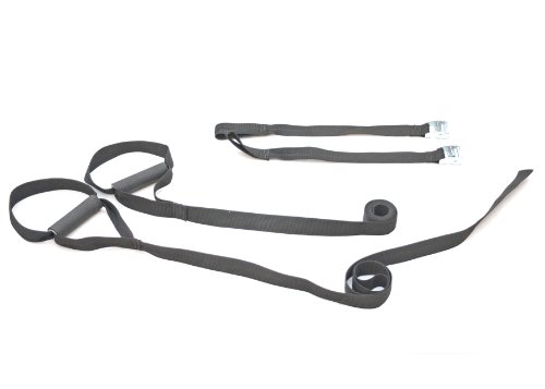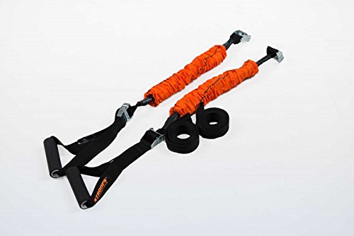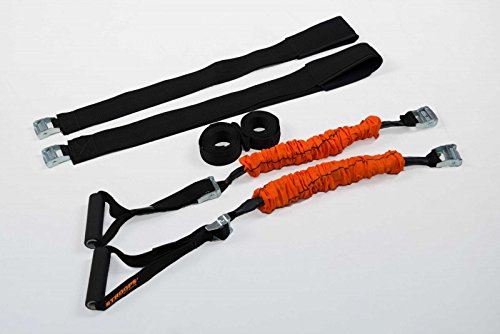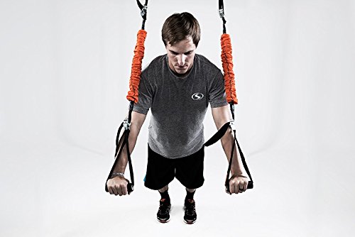 By incorporating Slastix bands (sold separately) into the suspension gym, you gain the benefits of graduated resistance training for upper and lower-body conditioning. | The time honored practice of using one's own body weight as resistance to build strength is as old as athletics itself. Suspension gyms, which fine-tune the process and add versatility to keep your muscles guessing, are both less expensive and much more portable than a comprehensive weight gym. Effective at developing overall body strength, balance, proprioception, and flexibility, Stroops' Body Weight Gym is made of rugged, quality materials with an array of applications. Relatively simple in design, it's comprised of two heavy-duty nylon straps with foot/hand loops and two anchors. Simply wrap the strap around any fixed overhead anchor (pull-up bar, swing set, etc.), grip the handles, and begin performing one of many free-motion exercises. For an added challenge, you can also incorporate Slastix resistance bands (sold separately) to gain the benefits of graduated resistance training. About Stroops Former Lehigh University star football player Shon Harker started Stroops in a basement, welding and hand-sewing product prototypes himself. His goal was to create a line of innovative personal training equipment that suited his own high standards, and the new company's products soon caught on. Stroops is now a globally-distributed manufacturer of a wide range of fitness products that help athletes build improve, quickness, and performance. 0