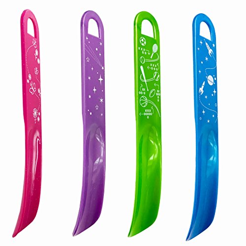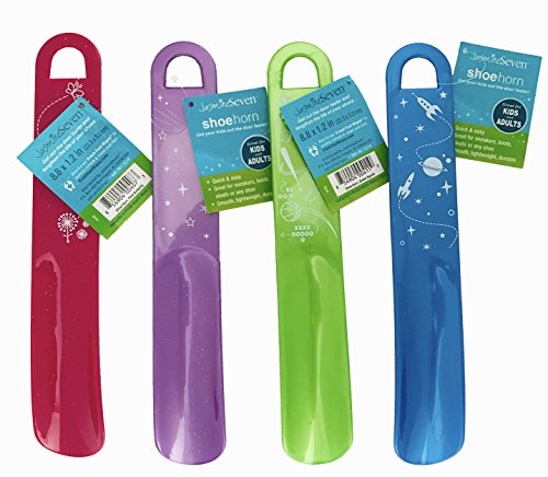 Product Description Jasmine Seven's Shoe Horns are great for kids! Our plastic shoe horns have soft edges and fun designs for kids to enjoy using. Great for sneakers, boots, cleats, and more. Smooth, lightweight, and durable. Perfect for all ages - like getting those fancy shoes on your infant, teaching your toddlers to put on their own shoes, or getting your tweens and teens out the door faster! Life is easier with the right tools. We hope our Jasmine Seven Shoe Horns bring your family a little happiness and ease. 0