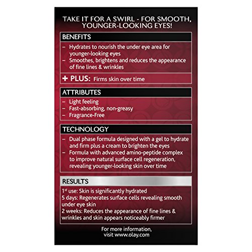 See the difference with Olay Regenerist Micro-Sculpting EyeSwirl eye cream. Its dual-phase formula is designed with a hydrating gel to firm the under eye area and a cream to brighten the eyes. This eye cream, contains an advanced Amino-Peptide Complex, improves natural surface cell regeneration to smooth, brighten, and reveal younger-looking skin over time. in just two weeks, it visibly reduces the appearance of fine lines and wrinkles. Its lightweight, fragrance-free, and fast-absorbing formula makes it a perfect addition to any regimen. This anti-aging eye treatment is safe for use under and around the eye. Lift and firm under eyes with Olay Regenerist Micro-Sculpting EyeSwirl eye cream.Feature