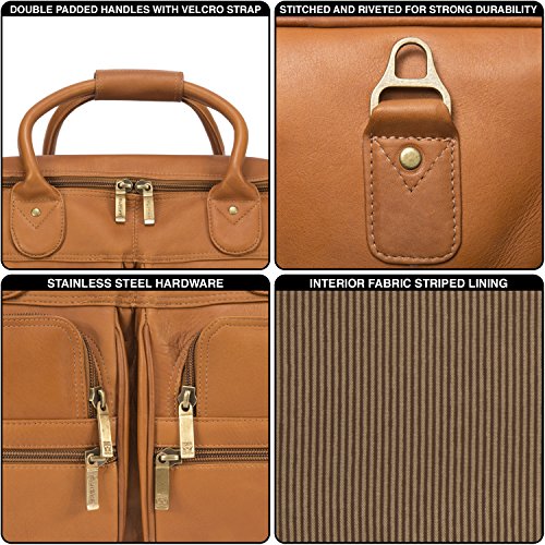 PRODUCT FEATURES: -Spacious interior compartment with heavy duty zippers that zip around enabling easy access to the interior -Four large front pockets plus two over-sized pockets on each end of the bag -Beautiful leather ID Tag with strong hardware -Adjustable leather shoulder strap with comfortable pad -Includes a branded protective dust bag -Product Dimensions: 22" (L) x 12" (H) x 13.5" (W)