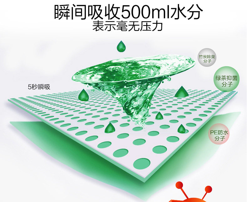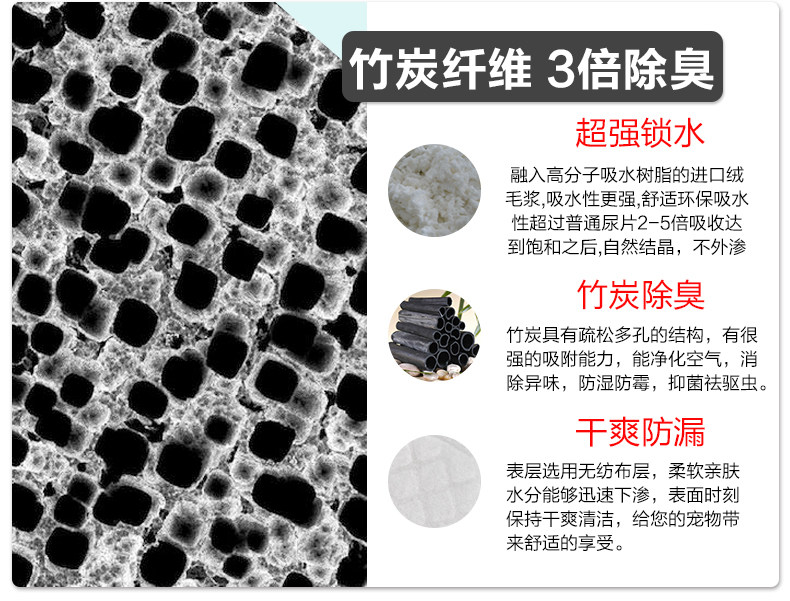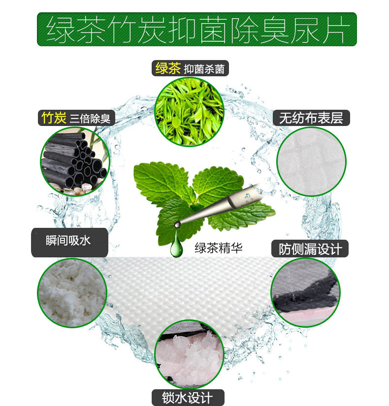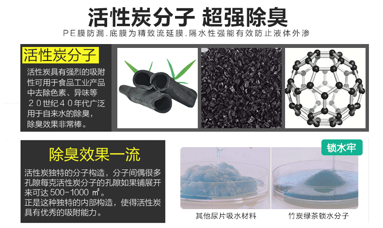 Material: pure wood pulp and super absorbent polymer made of high efficient absorbent layer, bamboo charcoal fiber, three times the deodorant